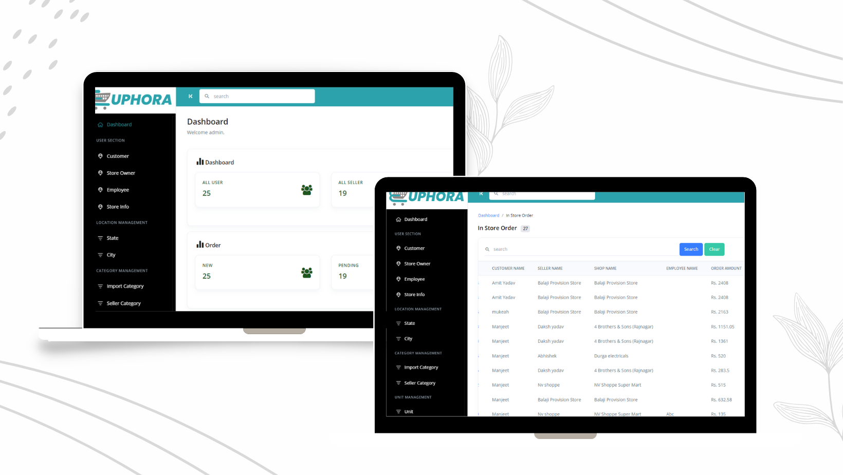 Store owner can manage product , category , coupon code , employee, order , store timing everything from application. Employee can manage pickup , delivery order from store to customer .