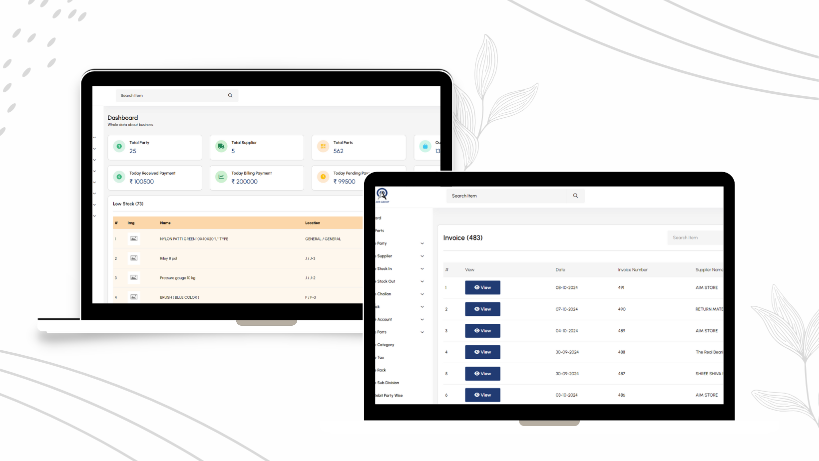 We developed an inventory management system for Aim Group, a machine manufacturing company. Their main challenge was tracking the availability of various machine parts. Before the system's implementation, it was difficult for them to determine where parts were located , such as which rack or section or whether specific parts were in stock. They also struggled with monitoring pending payments. Our solution addressed these issues, and now Aim Group can efficiently manage their inventory and track parts, greatly improving their operational efficiency.